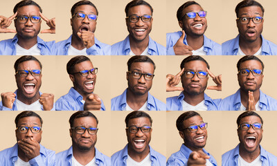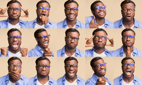 Set Of Funny Black Man Expressions And Emotions Over Yellow Background. Collection Of Male Grimaces
