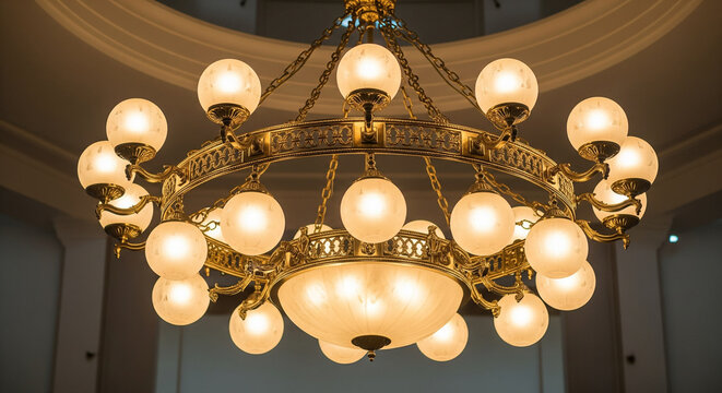 A classic golden-toned chandelier with multiple tiers of frosted glass globes hangs from an ornate ceiling. The fixture's polished metal frame and glowing bulbs create a soft, warm light that fills
