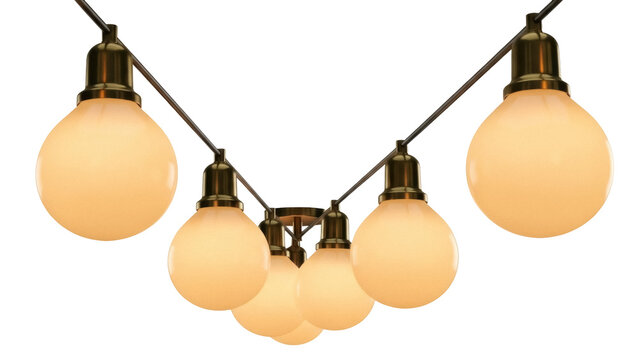 Multiple strands of illuminated decorative globe string lights, with their individual bulbs casting a soft, golden glow, presented as isolated elements on a clean white backdrop.