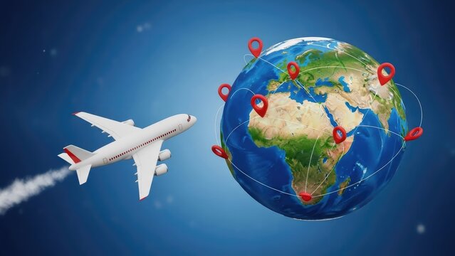 Airplane flying around the globe with multiple travel destinations