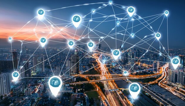 An aerial view of a modern city with multiple location pins connected by lines, symbolizing interconnectedness and communication