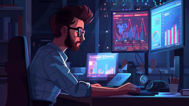 A modern office featuring multiple monitors displaying financial data, graphs, and charts, creating a sophisticated, technology-driven environment for data analysis and decision-making.