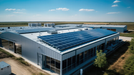 Multiple solar panels on the roof of a Large manufacturing building, Clean renewable energy concept.