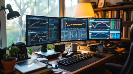 A modern trading desk setup with multiple monitors.