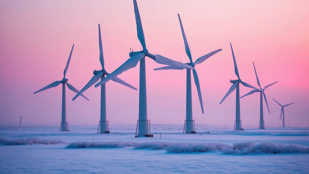 Offshore wind farm with multiple turbines at sunset, generating clean energy.