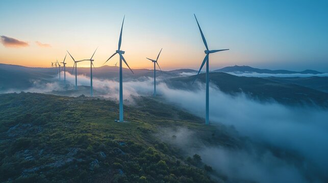 A breathtaking landscape featuring multiple wind turbines on rolling hills, illuminated by a colorful sunset with mist drifting through the valleys.