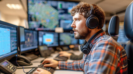 Side view of young male  working with multiple electronic devices. Blank screen for advertising text.