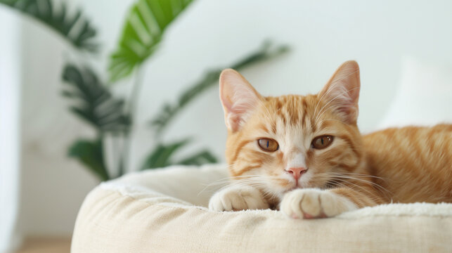Travel-friendly cat bed that folds into a compact bag, a small cat comfortably lying on it, in a bright and airy living room