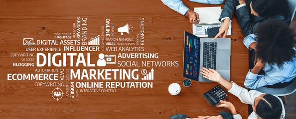 Multiracial analyst team use BI dashboard data to analyze financial report on meeting table. Group of diverse business people utilize data analysis by FIntech for business marketing decision. Concord
