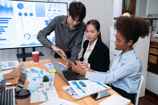 Multiracial analyst team use BI dashboard data to analyze financial report on meeting table. Group of diverse business people utilize data analysis by FIntech for success business marketing. Concord