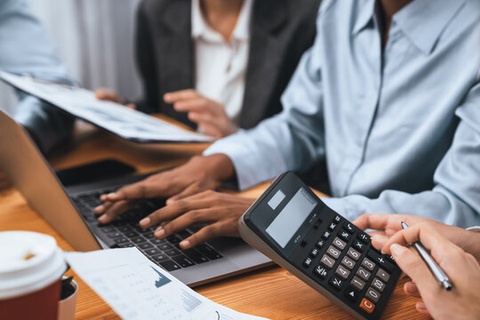 Multiracial analyst team use calculator and data science BI Fintech dashboard data to analyze financial report on office meeting table. Diverse business people for analytic teamwork. Concord