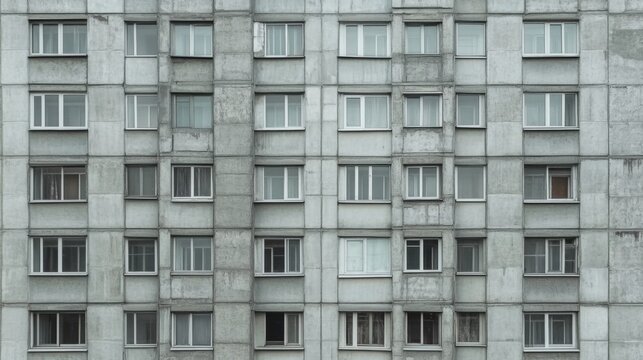 Facade of a Grey Multi-storey Panel building in Russia, Soviet architecture houses