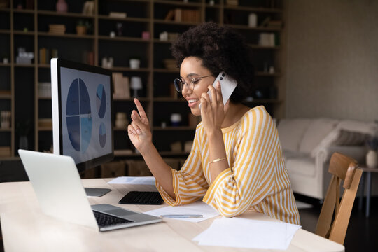 Focused smiling young African American businesswoman in eyeglasses involved in phone call conversation, using different modern tech gadgets, analyzing marketing research, discussing online project.