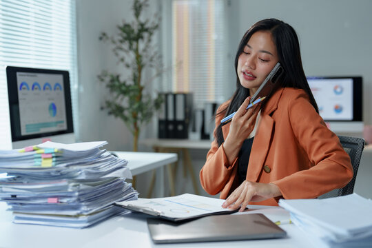 Young office worker managing paperwork while talking on a mobile phone, sitting at a desk surrounded by a laptop and large piles of documents, embodying a busy corporate environment