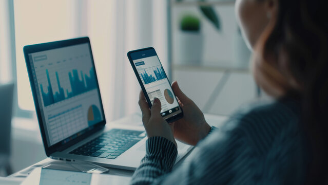 Business professional analyzing data with charts and graphs in a modern office setting, showcasing finance insights and productivity concepts