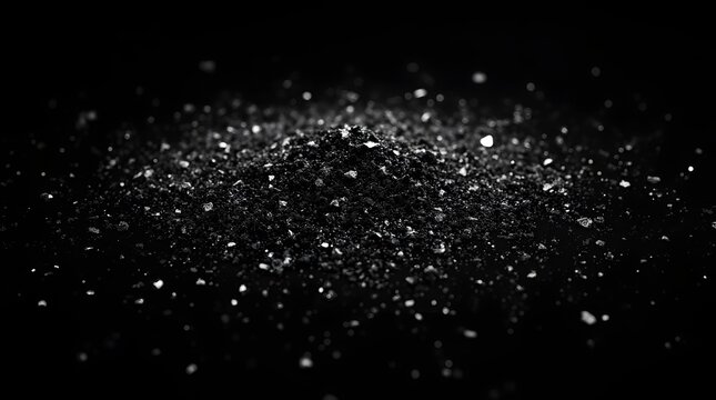 Amas de poudre de roche noire sur fond noir. Reflet métallique. texture de pierre.