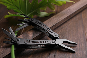 Modern compact portable multitool on wooden table