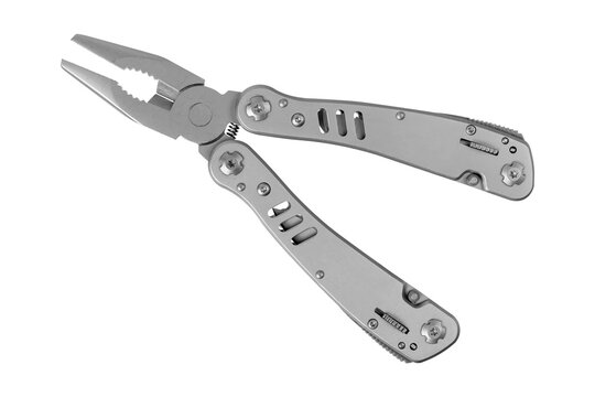 Unfolded multitool on a white background. Pliers in multitool isolated on white background.