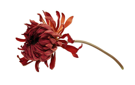 Red dried chrysanthemum flower on long stem image isolated transparent. Rich layered petals cut out photo png. Autumn-inspired botanical decor cutout element object photography
