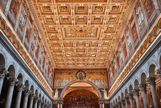 Rome, roof decorations detail and Triumphal arch, or arch of Galla Placidia. The Papal Basilica of St. Paul outside the walls
