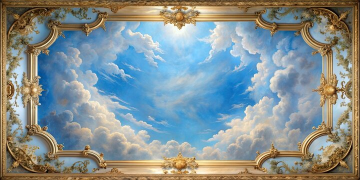 Heavenly ceiling mural featuring a blue sky with a baroque frame , sky, ceiling, mural, heavenly, blue, baroque