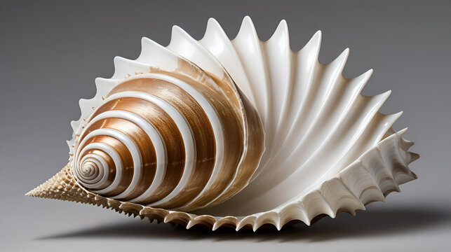 Elegant brown and white murex shell showcasing intricate spikes and curves from the ocean's depths on a neutral background