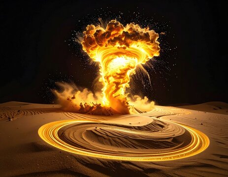 Fiery, mushroom-cloud explosion in desert at night, with swirling sand patterns illuminated by its glow