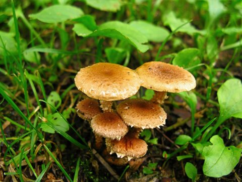 Cluster of wild mushrooms growing on grassy forest floor with soft morning light