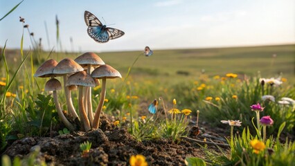 A cluster of mushrooms sprouting from the ground in a sunny meadow with wildflowers and butterflies nearby, green, nature, fungi