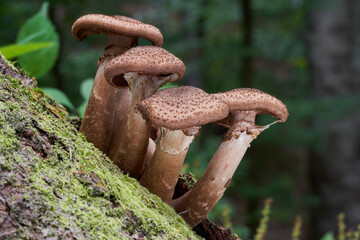 Edible mushroom Armillaria ostoyae in the spruce forest. Known as Honey Mushroom or Dark Honey Fungus. Wild mushrooms growing on a spruce stump.