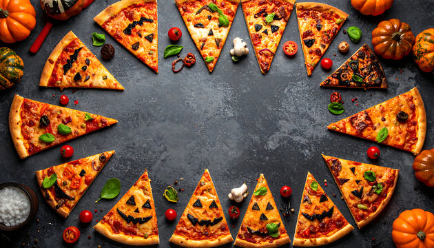 Pizza slice ring with carved jack o lantern toppings, cherry tomato, basil and autumn squash garnish creating festive Halloween mood