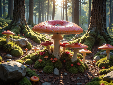 A mushroom ring in the forest glows with fairytale magic under golden sunlight.