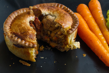 Savoury pie served with glazed carrots and mushy peas.