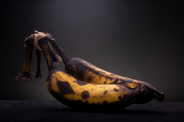 Spotlight on low key still life of a couple of overripe bananas with black spots and bright yellow parts contrasted against a dark grey background