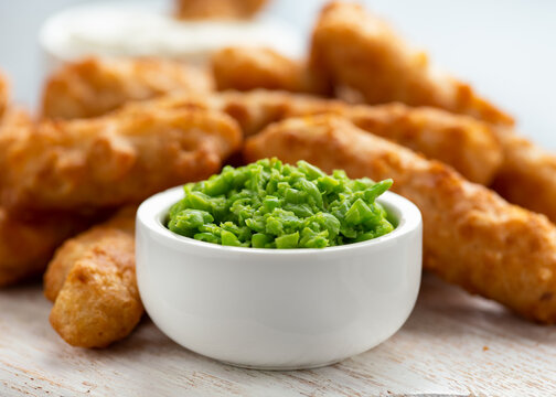 Battered Haddock fish, mini fingers with mashed peas, tartar sauce on white wooden board