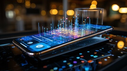Abstract Digital Sound Wave Equalizer with Glowing Particles on Dark Blue Background
