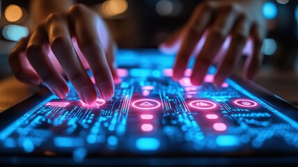Asian music producer wearing vr headset playing midi controller in neon home studio