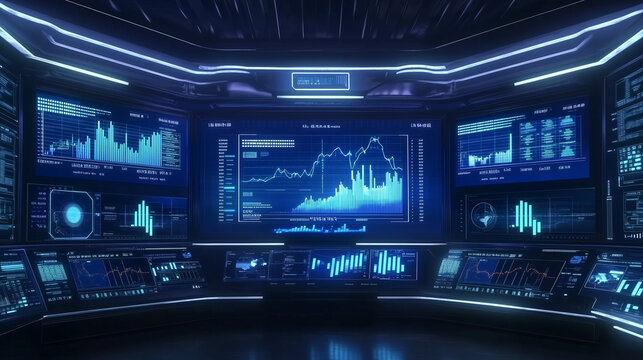 Futuristic Digital Stock Market Control Room with Multiple Data Screens Displaying Financial Charts