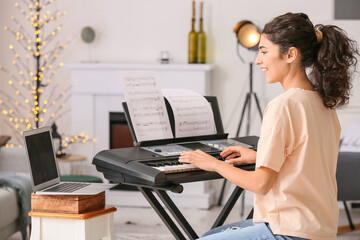 Young woman giving music lessons online at home