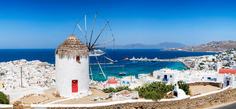 View of Mykonos and the famous windmill from above, Mykonos island, Cyclades, Greece
