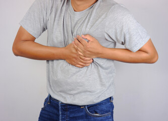 Close-up. Man's hand holding his chest. Chest pain. Man in pain massaging the affected area, Chest pain can be caused by heart attack, myocardial infarct or ischemia, myocarditis, pneumonia. Emergency
