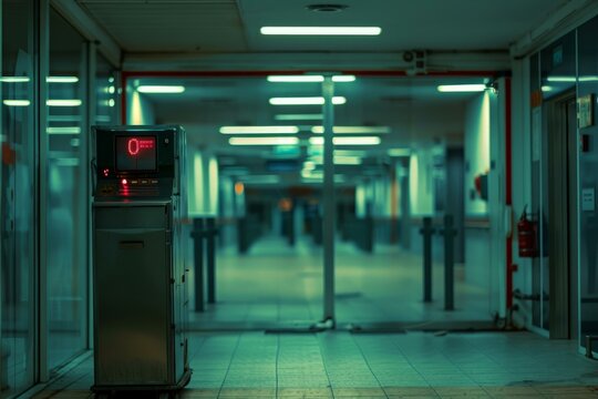 Female healthcare worker walking down dimly lit hospital corridor. View from behind, showing scrubs and ponytail. Eerie blue lighting creates mysterious atmosphere.