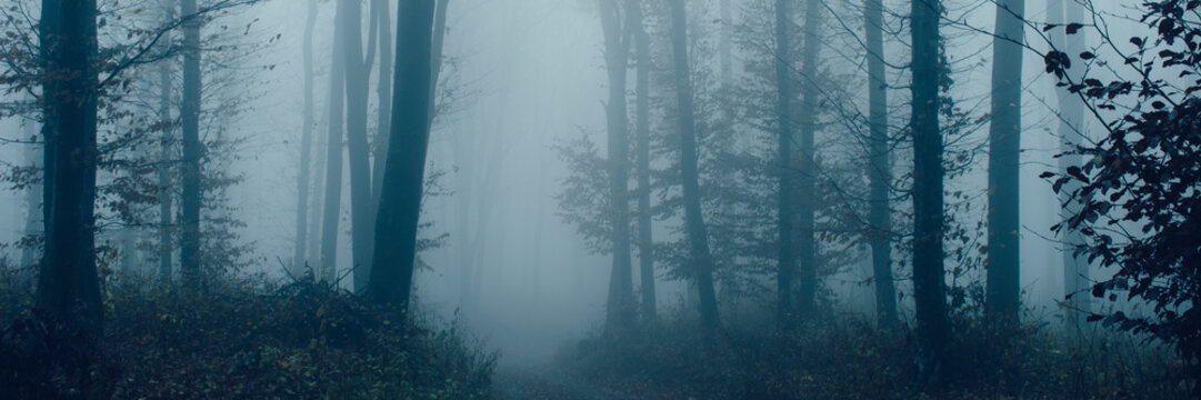 Mysterious haunted mansion foggy landscape atmospheric photography eerie environment dark viewpoint spooky concept