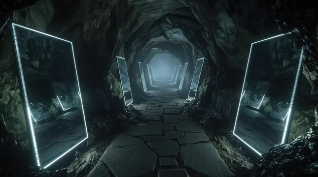 Transparent ringed tunnel revealing forest path leading toward smoke-filled two-story house
