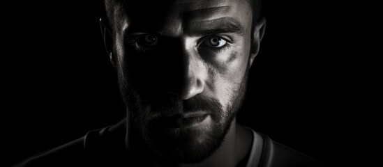 Dramatic close up black and white portrait of a man against a black background illuminated by one light source with copy space image