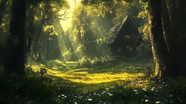 Enchanted forest cottage bathed in golden sunlight, perfect for storybook illustrations or idyllic lifestyle branding, evoking peace and escapism beautifully