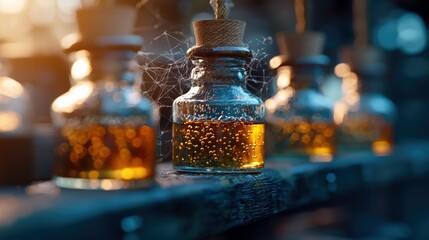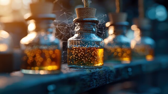 Enchanting luminous bottles filled with magical flora in a mystical setting