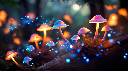 Glowing magic mushrooms in a fairy tale scene. Light particles and fireflies add enchantment. Forest background creates a mystical atmosphere.