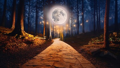 a mystical pathway illuminated by warm lights in a serene moonlit forest