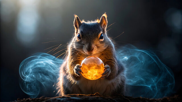 Magical squirrel holding a glowing orb in misty forest